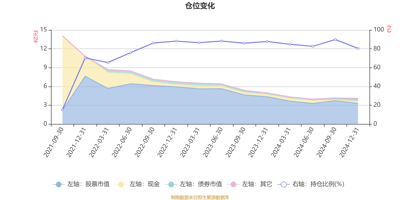 据定期报告数据统计,近三年平均股票仓位为83.52%,同类平均为84.97%。2024年三季度末基金达到89.88%的最高仓位,2021年三季度末最低,为15.33%。
